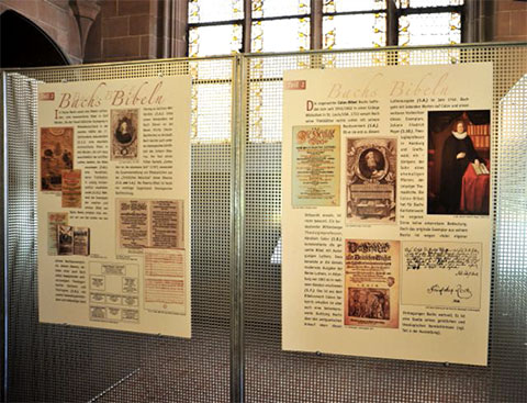 Die 17 Tafeln der Ausstellung informieren über die Bedeutung und die praktische Verwendung der Bibel in Bachs Werk, in seiner Familie und seinem persönlichen geistlichen Leben. Unbestritten war Johann Sebastian Bach (*1685 in Eisenach; † 1750 in Leipzig) nicht nur ein genialer Musiker, sondern auch ein Verkündiger und Zeuge des Evangeliums. Der schwedische Theologe und Bischof Nathan Söderblom bezeichnete 1920 in einer Predigt Bachs Passionsmusiken als ein fünftes Evangelium.