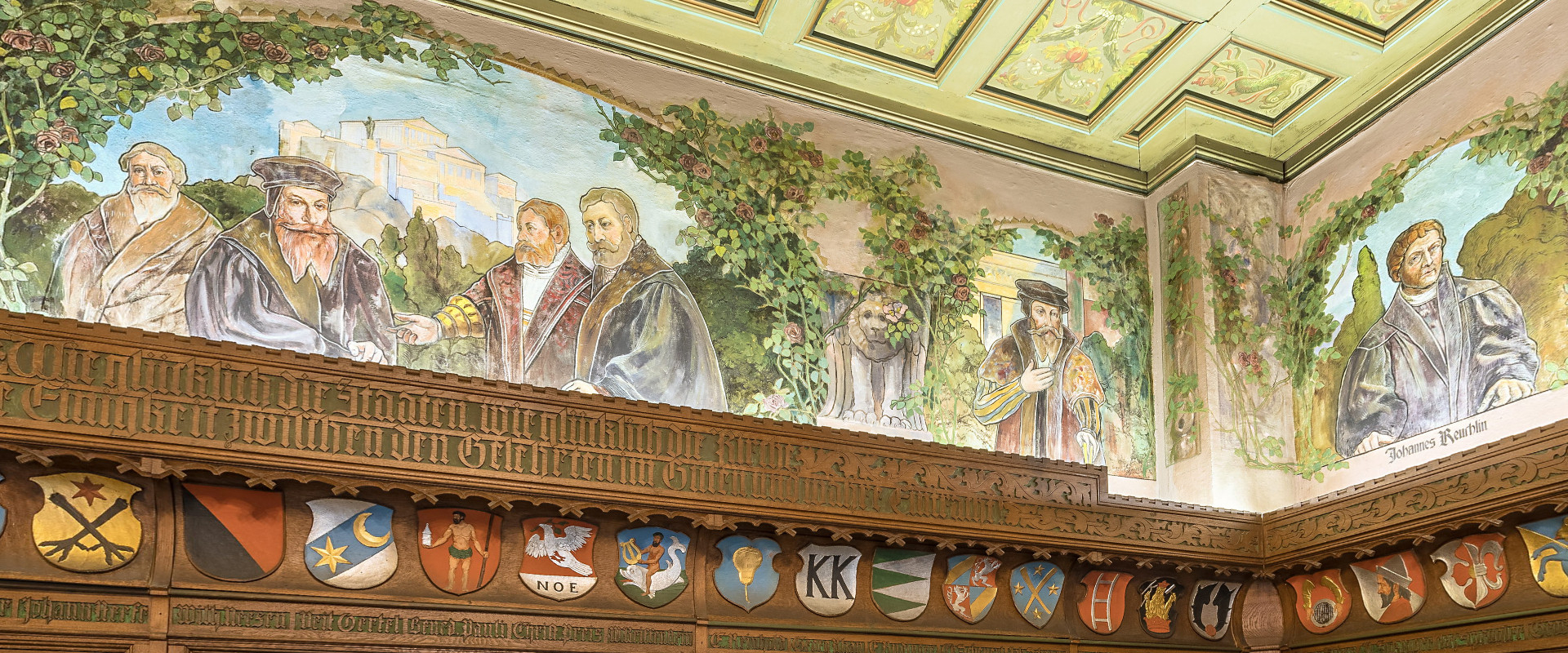 Auf der Südwand des Humanistenzimmers werden mit einem großformatigen Zitat die Rechtswissenschaften gewürdigt: