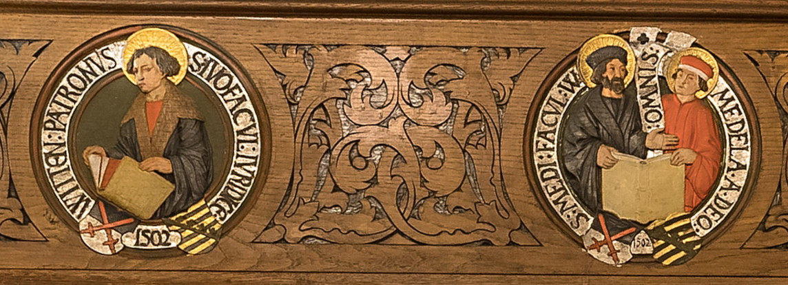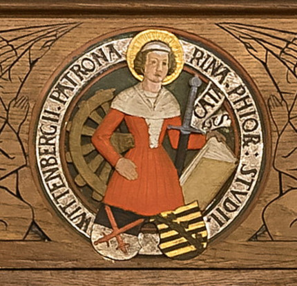 Über den Türen finden sich Abbildungen von Wittenberger Fakultätssiegeln: über der südlichen Tür das Siegel der juristischen Fakultät mit dem Heiligen Ivo als Schutzpatron und daneben das der medizinischen Fakultät mit den Schutzherren St. Cosmas und St. Damian. Über der nördlichen Tür befindet sich das Siegel der philosophischen Fakultät mit der Heiligen Katharina als Schutzpatronin.