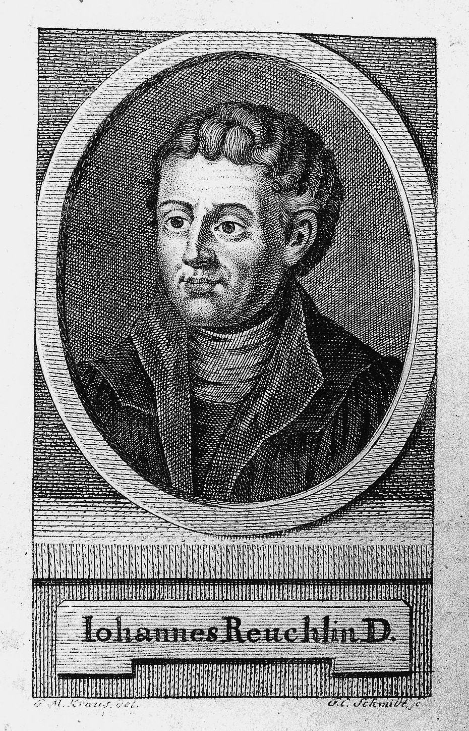 Johannes Reuchlin (Radierung von Georg Christoph Schmidt, 18. Jh.). Der Pforzheimer Gelehrte (1455—1522) war Humanist und Mentor des jungen Melanchthon. Er gilt zudem als Begründer der christlichen Hebraistik und bedeutender christlicher Kabbalistiker.