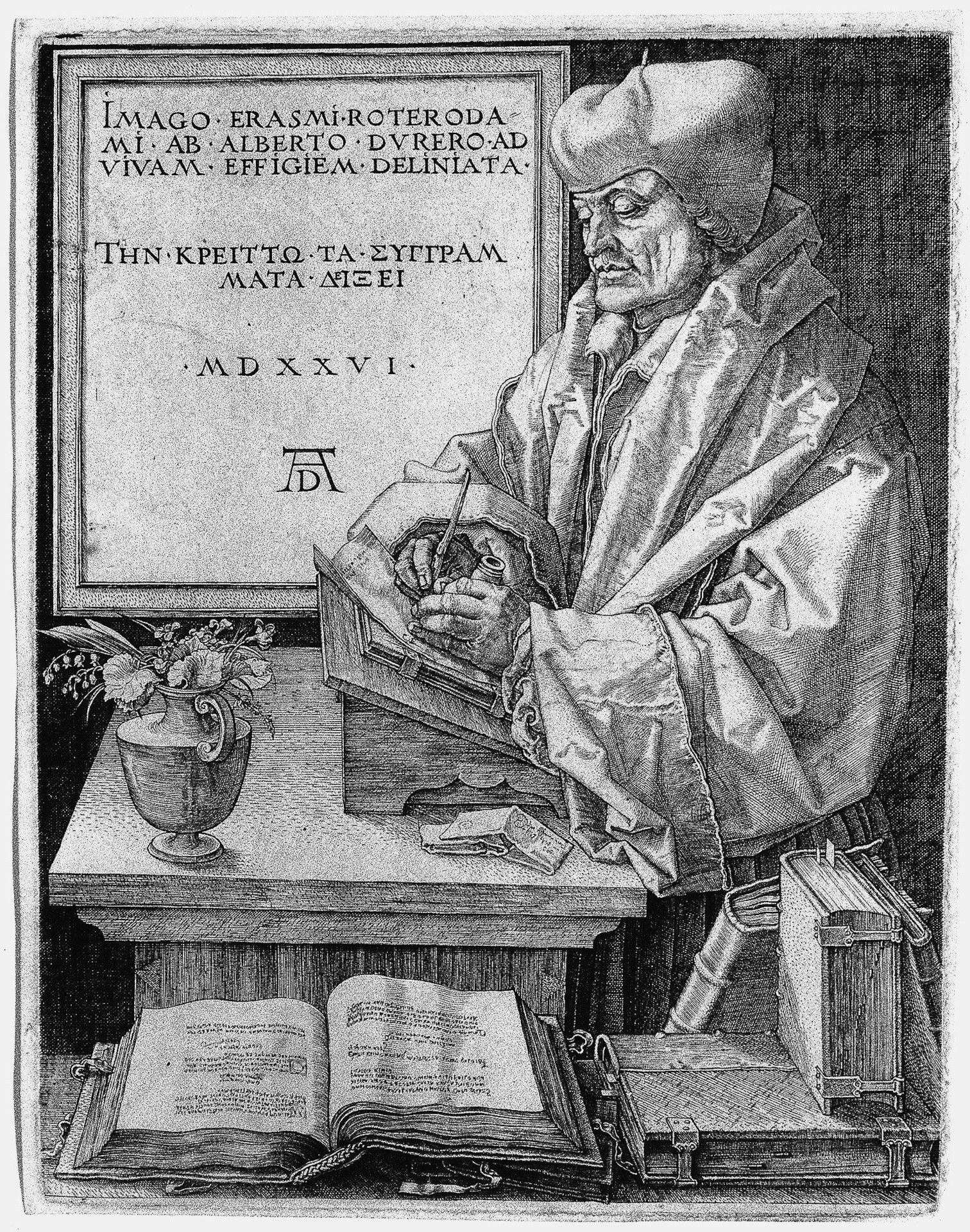 Desiderius Erasmus von Rotterdam (Kupferstich von Albrecht Dürer, 1526). Der Theologe und Humanist (1466/67—1536) stand im Kontakt mit führenden Gelehrten in Europa und war Autor vielfältiger philologisch-rhetorischer, pädagogischer, geistlicher, exegetischer, katechetischer und moralphilosophischer Werke. Erasmus setzte sich für eine Reform der Kirche ein, lehnte jedoch die Reformation ab.