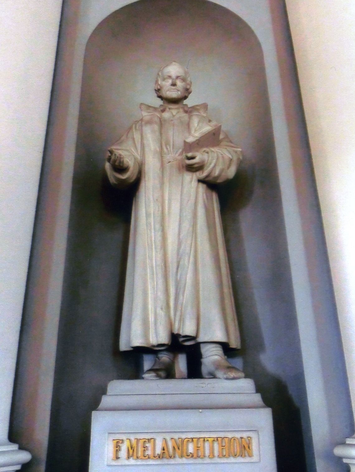 Das Melanchthon-Denkmal in der Kathedrale von Helsinki von 1886. Weitere Statuen sind Martin Luther und dem finnischen Reformator Michael Agricola gewidmet.